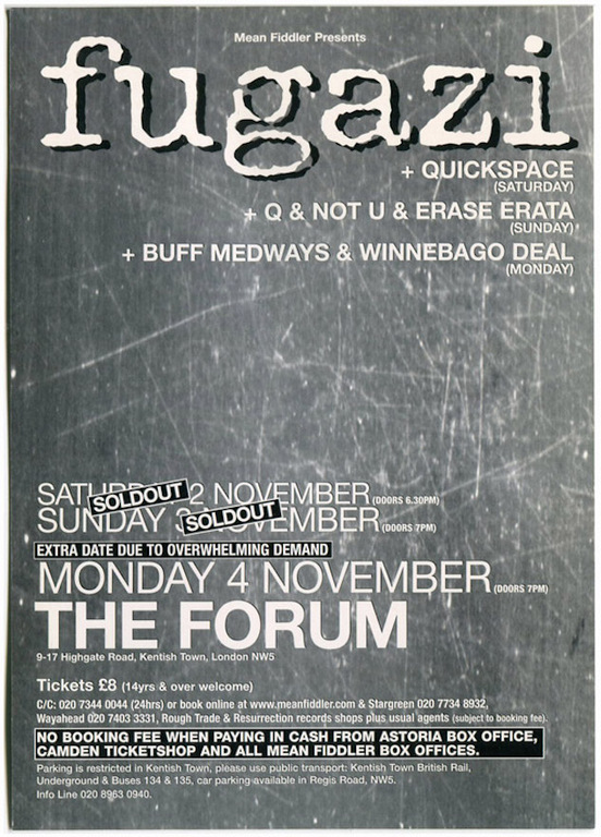 This was actually my 34th Birthday and my then girlfriend asked me what I fancied doing. I said well actually, I'd like to go and see Fugazi! She was so NOT into my music - I'm a punk rocker and she was a bit of a pop queen - but to her credit she said it's your birthday, we'll do what you want. & we did.