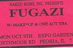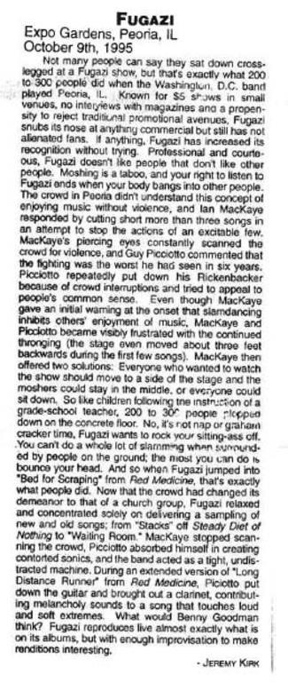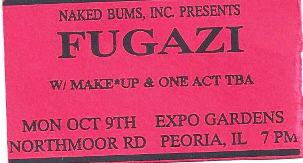 I was at this show. It was my first Fugazi experience and they blew me away. So many great memories of that night. It was a few nights before the Rainbo rollerskating show in Chicago and I was down @ school in Champaign. Someone sold my ticket for the Chicago show, so I got a ticket for Peoria and ditched class to go see Make*Up, not having a strong impression of Fugazi from the records. Turns out, they are great (duh).