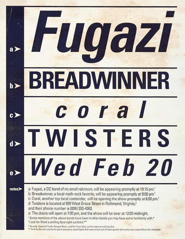 This gig at Twisters in the city of Richmond, Virginia completes the short stretch of (five) regional dates Fugazi set out to play in the winter of 1991. It also relates to the fifth out of no less than nine times total Fugazi would hit this particular city, a dead cert it appears, spanning their entire career between 1987 and 2002.
