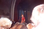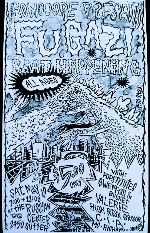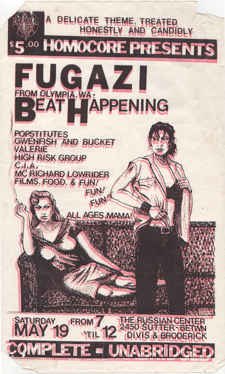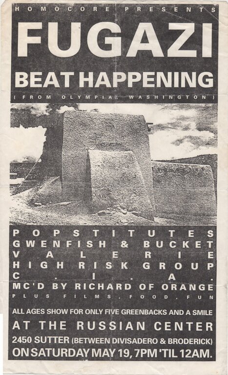 Life-changing show with many cool openers like Popstitutes, but a ways in tbh crowd was not quite ready for the plaintive confessionals of Beat Happening who were all but vibed offstage. (Its not that beat happening weren't good, it was this crowd was beyond amped and not in a hand-wringing sort of mood.) Thats when the trouble started. A guy came out after BH, and tried their hand at an Ian-esque lecturing of the crowd, along the lines of "If you were really punk, you'd love Beat Happening and open your ears, so you're all actually a bunch of total fakes," etc. Was he right? Possibly, but his holier-than-though provocation of the crowd worked better than he thought. About maybe 5-10 minutes through his extended spoken word solo judgement of everyone assembled, a punk with I believe large green liberty spikes suddenly swung upside down from the balcony (wrapped his legs around the railing), clutching a large fire extinguisher and while laughing maniacally, blasted the guy off the stage.. promptly filling auditorium with white fog of CO2 making it hard for everyone to breathe. This was the situation Fugazi came out to and both the show and the kvetching that followed were legendary. To my knowledge, that was possibly the first but definitely the last punk show the Russian Center put on.