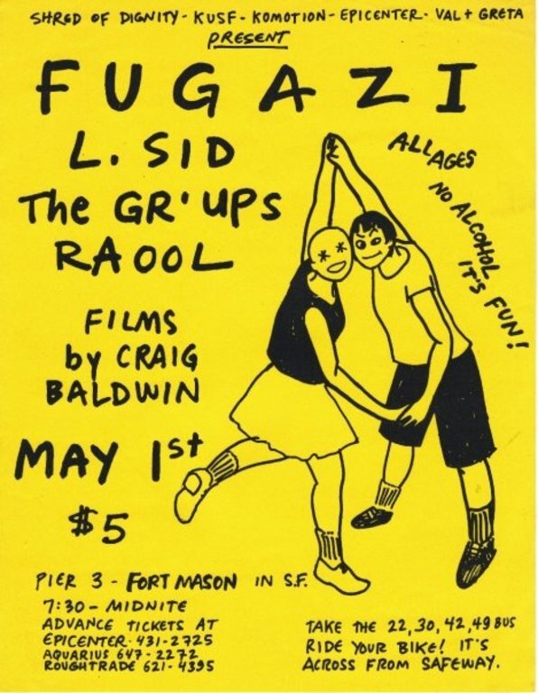 This show felt like a turning point. After years of seeing them at Gilman Street or the SF Women's Building or whatever, now here they were in an airplane hangar playing in front of what felt like thousands of people. The sound, as I recall, was band-in-a-garbage-can awful—what you'd expect from an airplane hangar. I was in college in San Jose, and we drove up for the show. We had fun, but it was a weird experience, unlike the Fugazi that had been a part of my life since high school, now with the well-documented calm-down direction from the stage and the legions of numbskulls in the audience.
