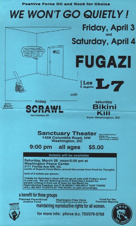 This benefit concert, together with the one on the following night at the Sanctuary Theater in D.C. (see FLS #0422) completes Fugazi’s Rock for Choice hat-trick, in the wake of the memorable January 24 gig at the Hollywood Palladium, CA a couple of months earlier.
