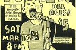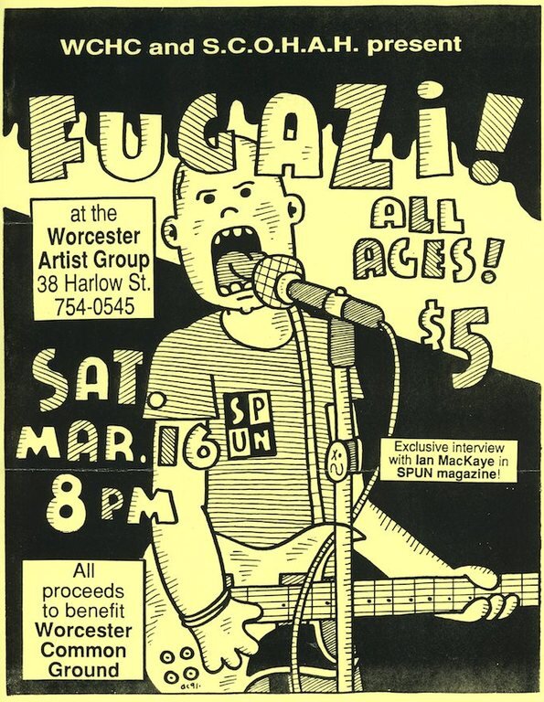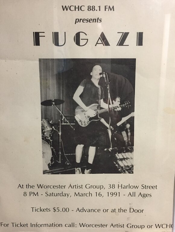 Most shows at Worcester Artist Group (WAG) had 50-60 people. Some had 10. A really big show might have drawn 150. The 400+ people here for Fugazi was total insanity for this space. Ian mentions issues with the fire marshall. And the crowd overflowing on to the stage was continually knocking out the monitors. But what a good show. They played Boston the next day, but this Worcester show was so much more energetic. Guy seemed to really into it all night.