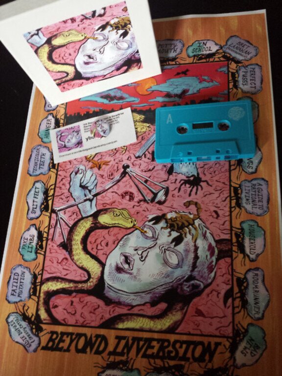 This cassette version of the compilation arrives with a download code, a button, and a fold-out poster featuring art by Leah Wishnia. This release is also available digitally here.